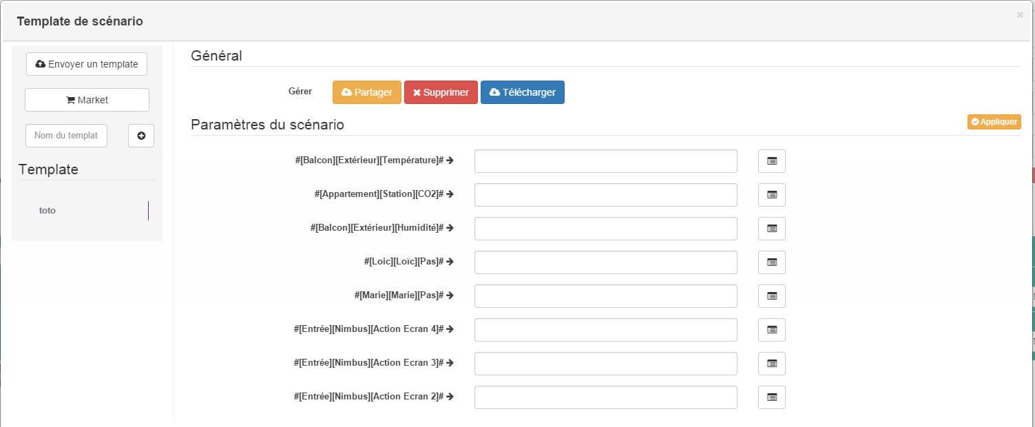 Mit dieser Funktion können Sie ein Szenario in eine Vorlage für umwandeln Wenden Sie es beispielsweise auf ein anderes Jeedom an oder teilen Sie es auf dem Markt. Von dort aus können Sie auch ein Szenario wiederherstellen vom Markt.
