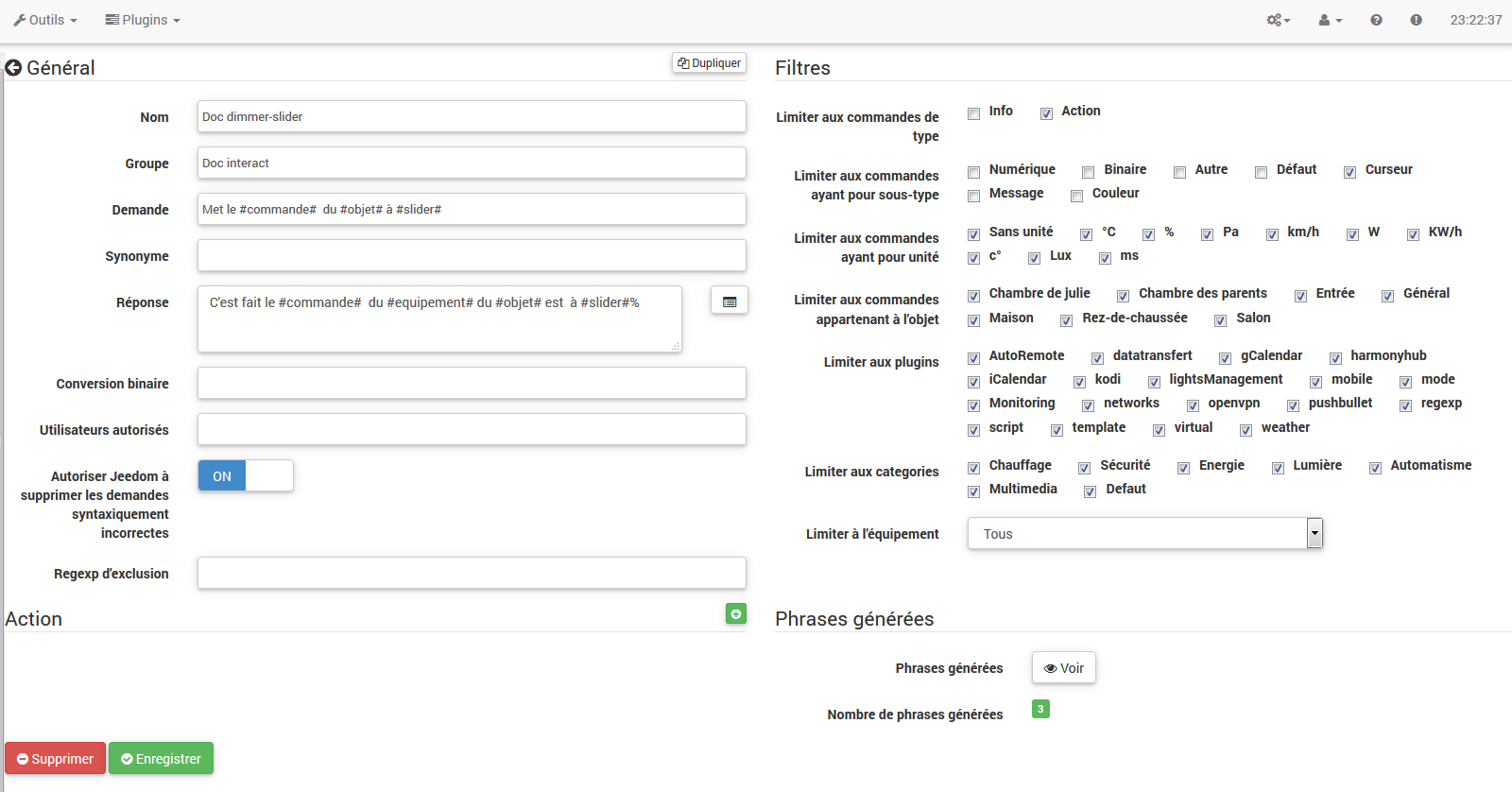 Es ist möglich zu erstellen Regexp Ausschluss: Wenn ein generierter Satz mit diesem regulären Ausdruck übereinstimmt, wird er gelöscht. Das Interesse besteht darin, falsch positive Ergebnisse entfernen zu können, dh einen von Jeedom erzeugten Satz, der etwas aktiviert, das nicht dem entspricht, was wir wollen, oder das eine andere Interaktion stören würde, die einen ähnlichen Satz hätte.