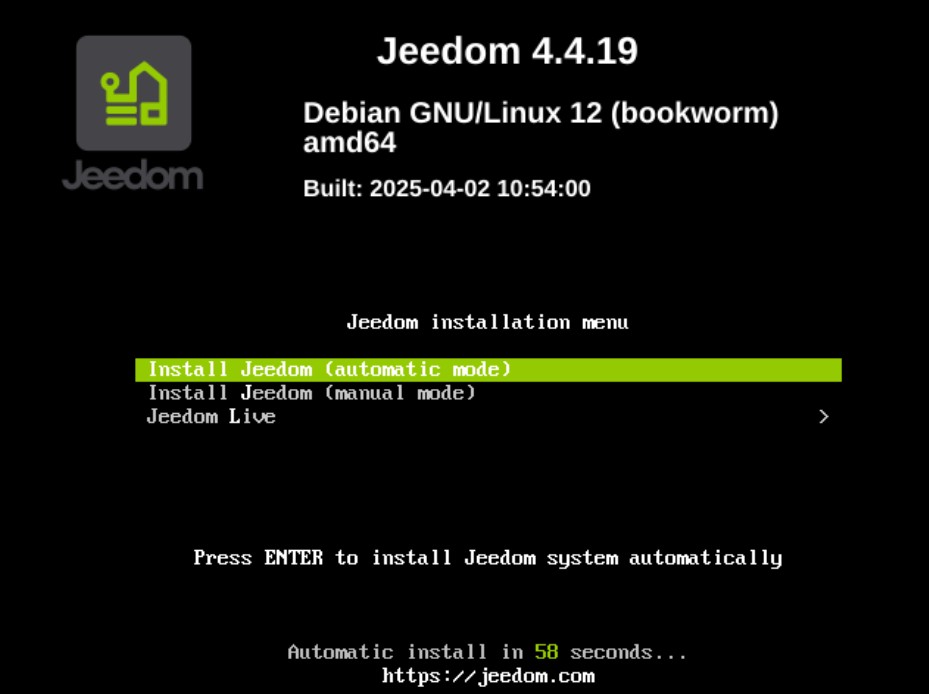 Install Jeedom (manual mode) : dans ce mode, vous devez renseigner manuellement la configuration du système à installer (langue, pays, réseau, support de stockage, etc.).